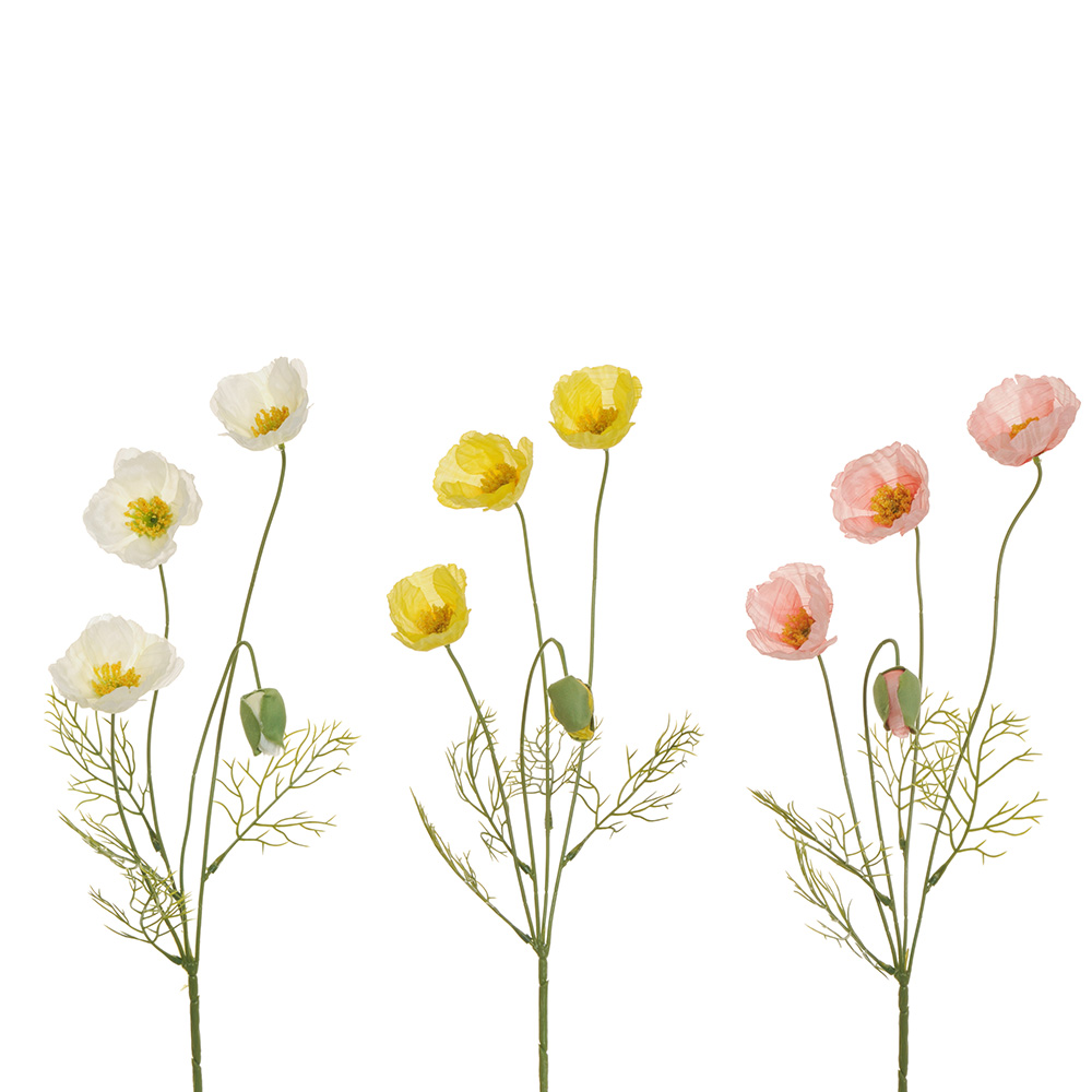 Branch with 3 assorted-color poppies in polyester, with bud and leaves Dimensions: 60 cm height