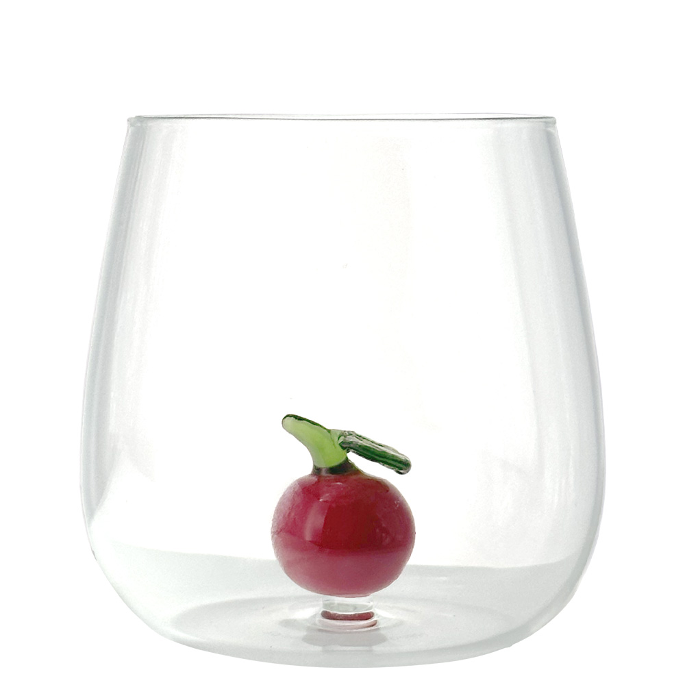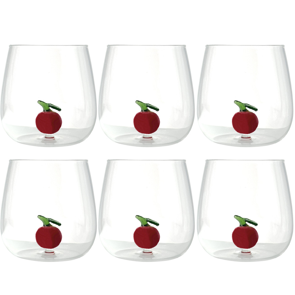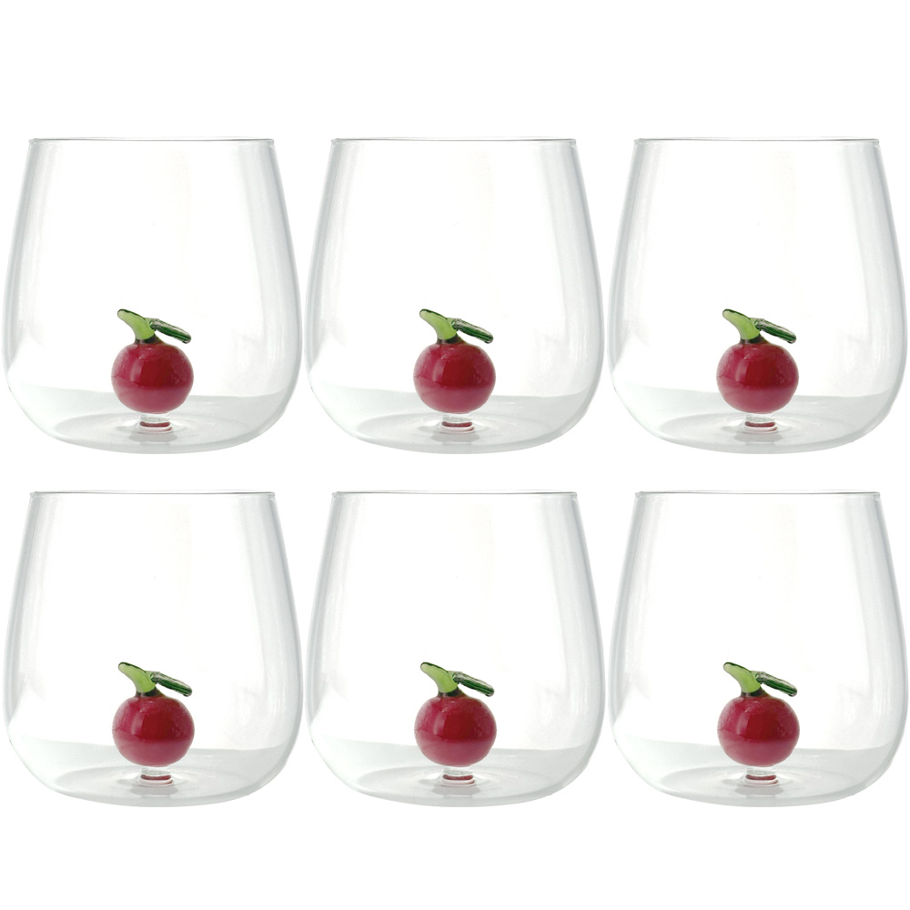 Each glass encloses a small blown-glass sculpture representing a fruit, carefully crafted with artisanal skill and exquisite detail.