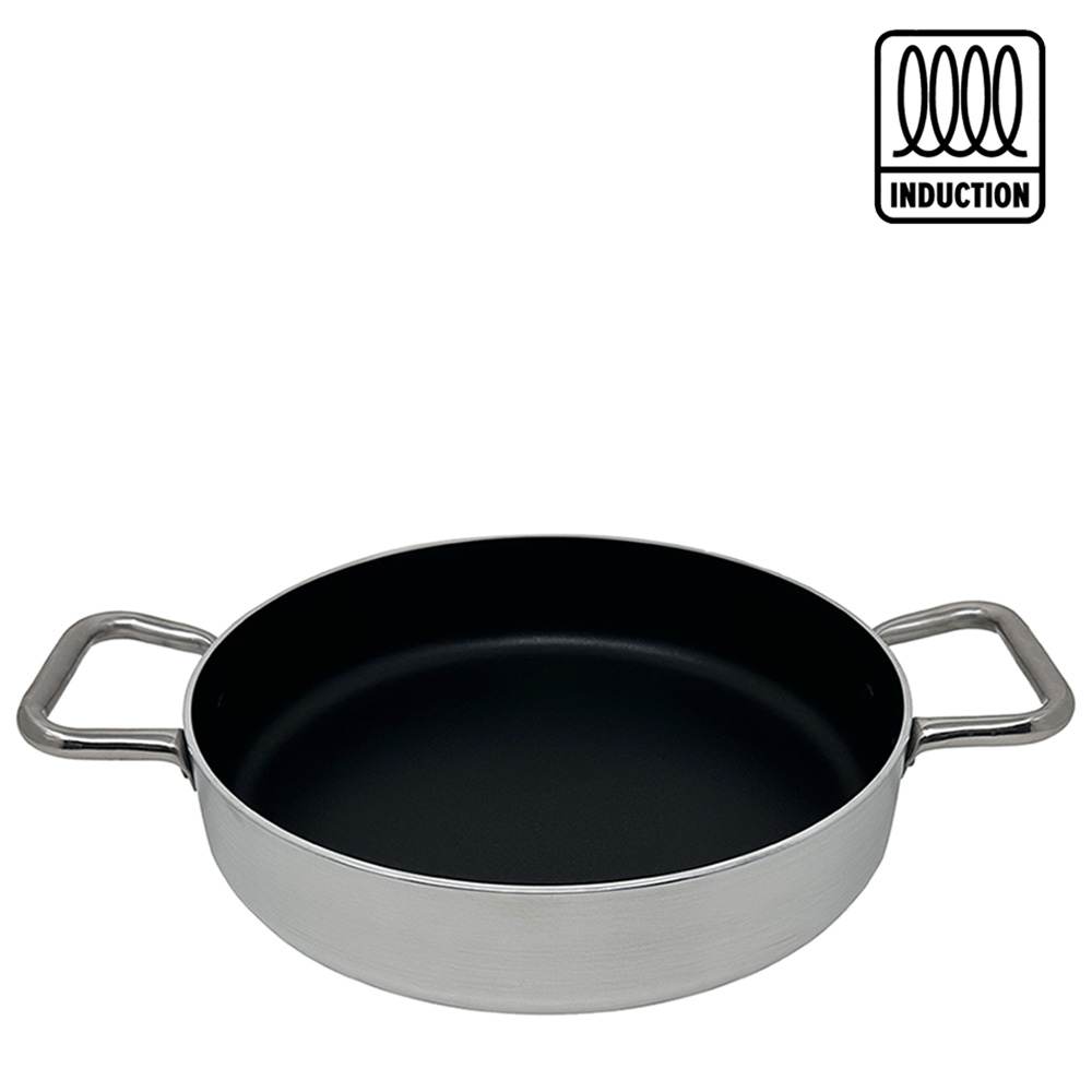 Basic saucepan with straight edges, made of non-stick aluminum.