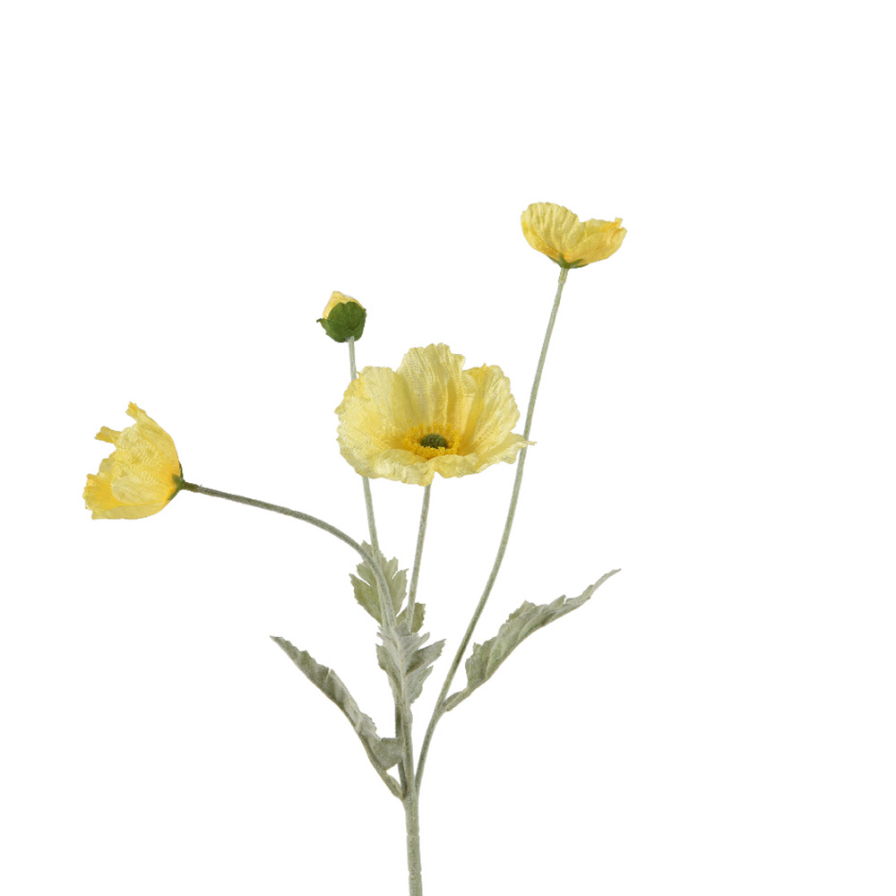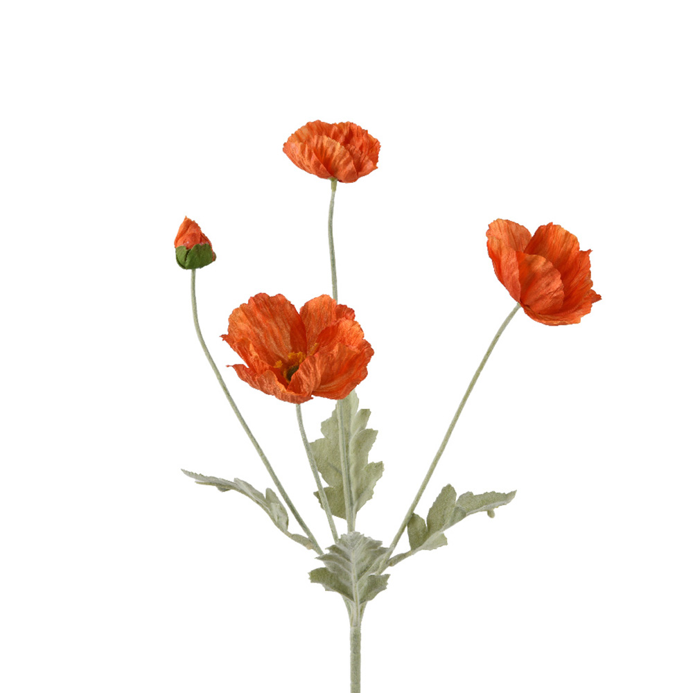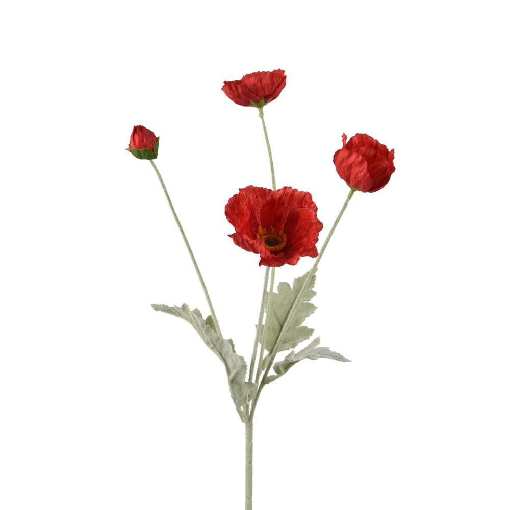 Branch with 3 poppies and a bud in flocked polyester with leaves