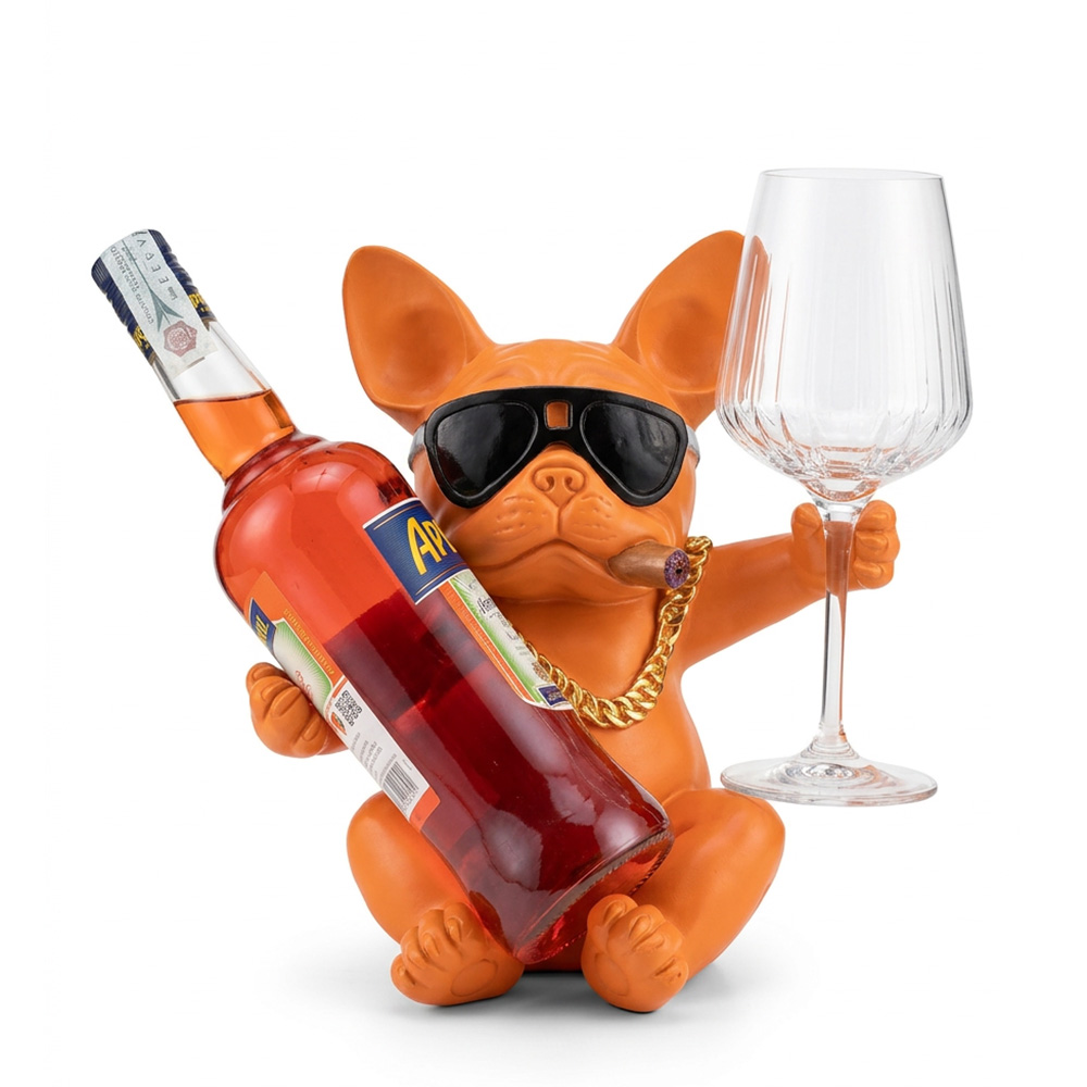 Bulldog spritz holder in orange resin. Dimensions: 24.5x20x27.5h cm One paw is designed to hold a glass, while the other perfectly accommodates an Aperol bottle.