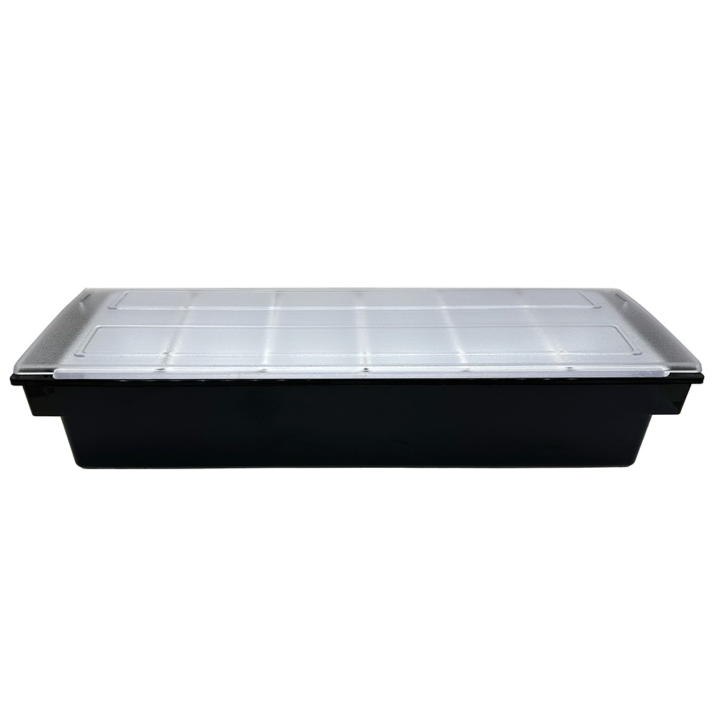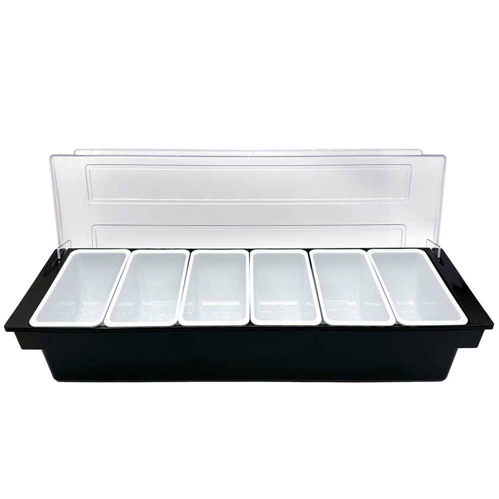 Black plastic condiment holder with 6 removable compartments. Dimensions: 49x16x10h cm