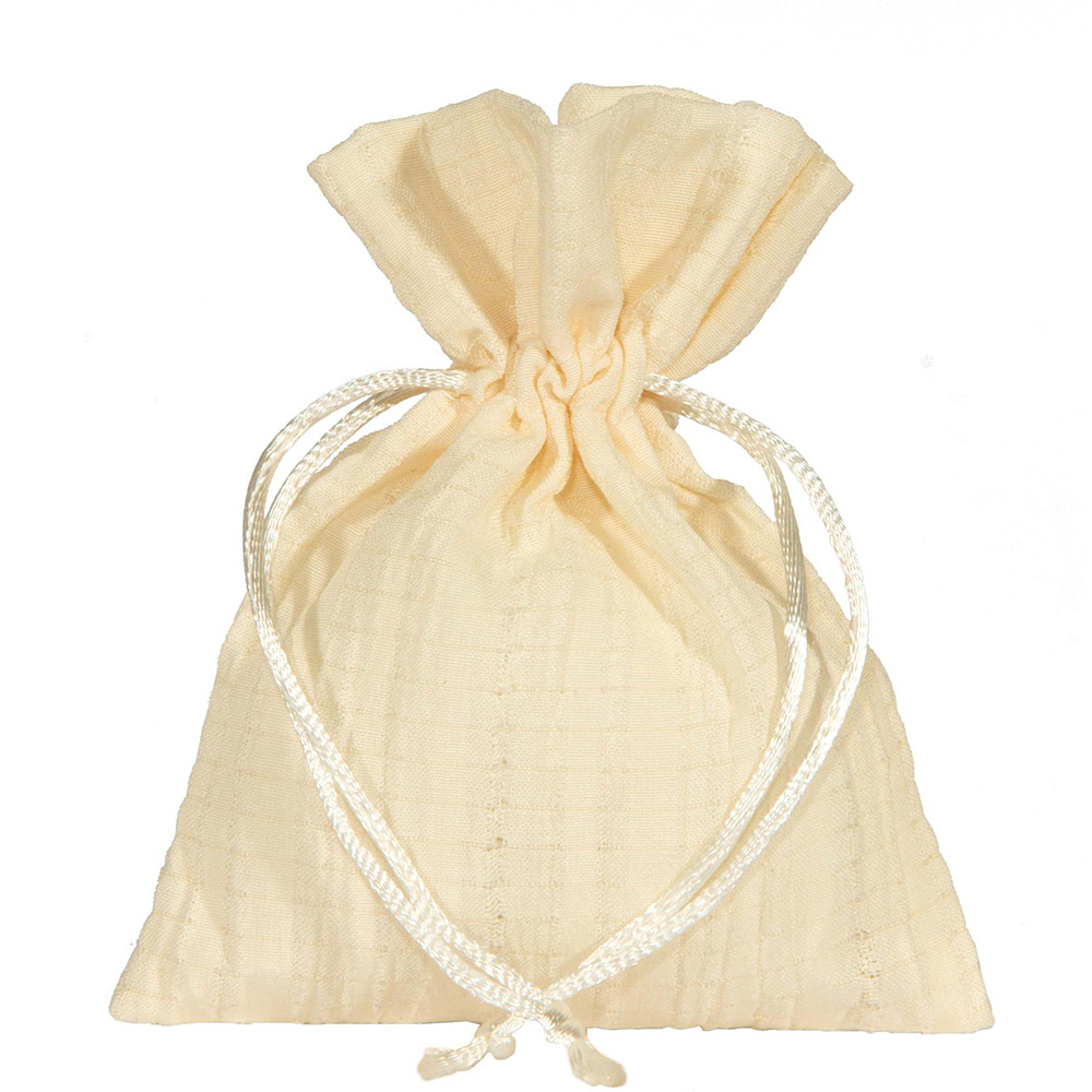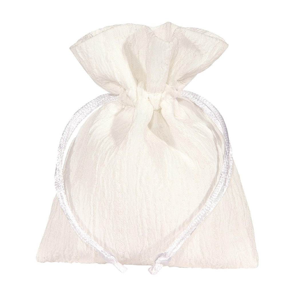 Crêpe-Effect Polyester Fabric Pouch, with drawstring closure Size: cm 9 × 12 h Sold in packs of 10 pcs