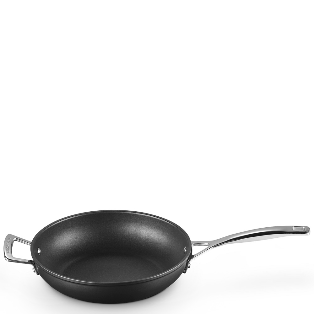 Deep frying pan with long handle and helper handle, made of non-stick aluminum.