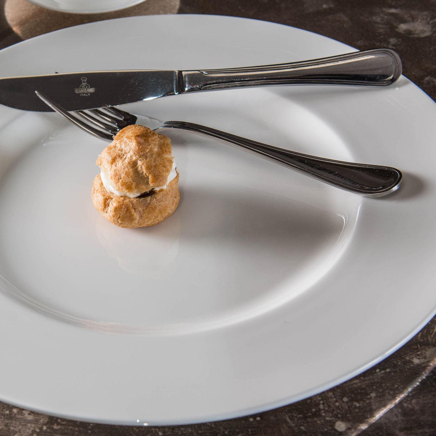 Flat plate cm.32 Lisa Marie, in Bone China, is characterized by a flat rim and a traditional shape.