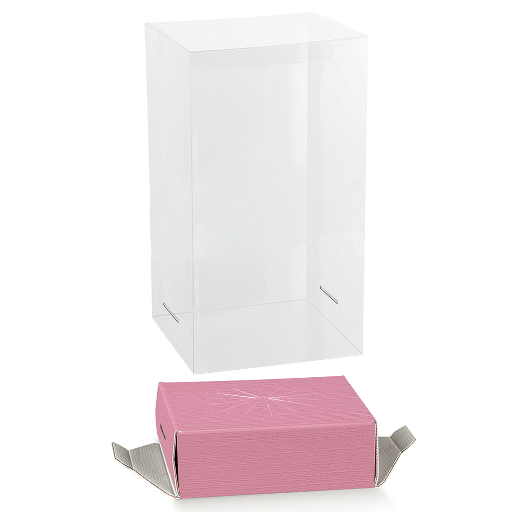 Box with a fuchsia die-cut base to hold an egg, made of fiber-effect cardboard with a clear PVC display window