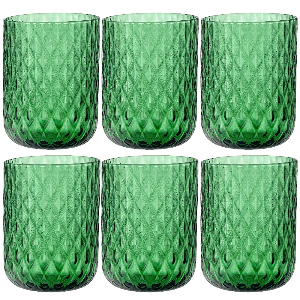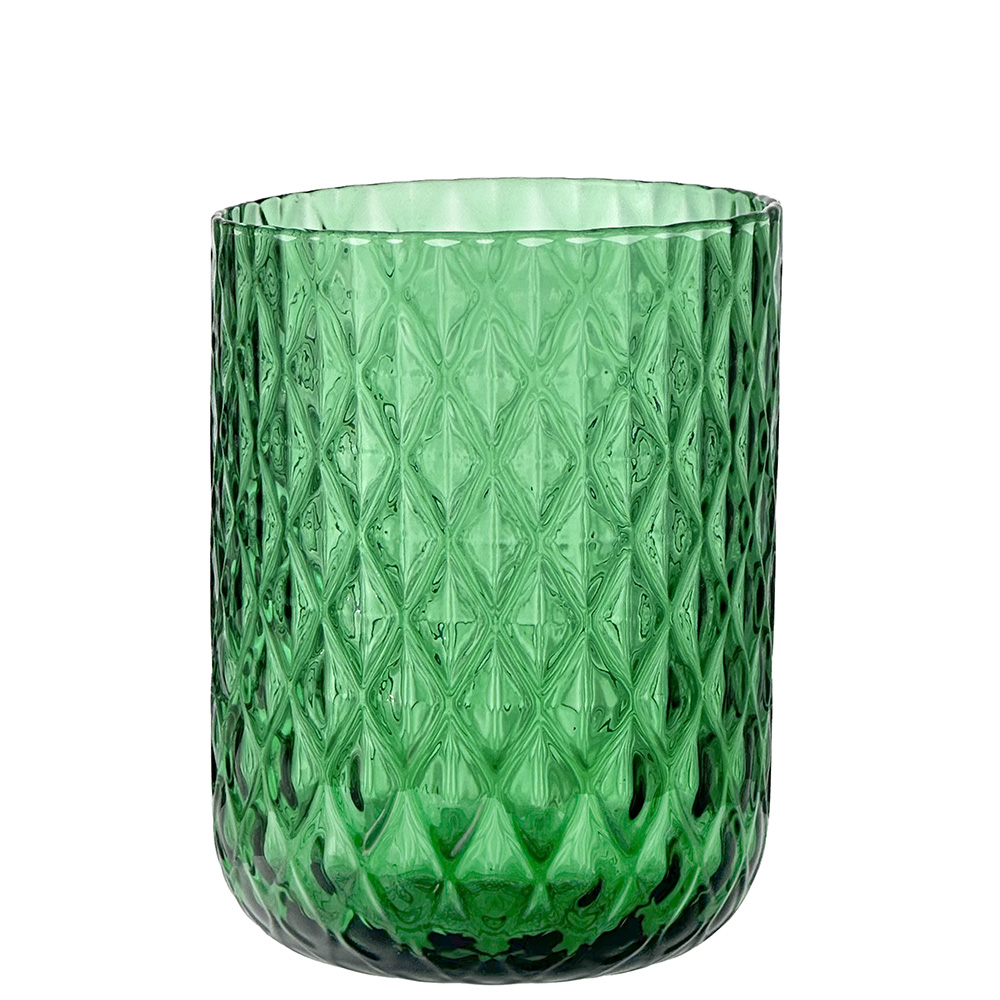Made of hand-blown glass, these tumblers combine the artisanal delicacy of the material with a textured surface that captures and reflects the light, creating a luminous and refined effect.
