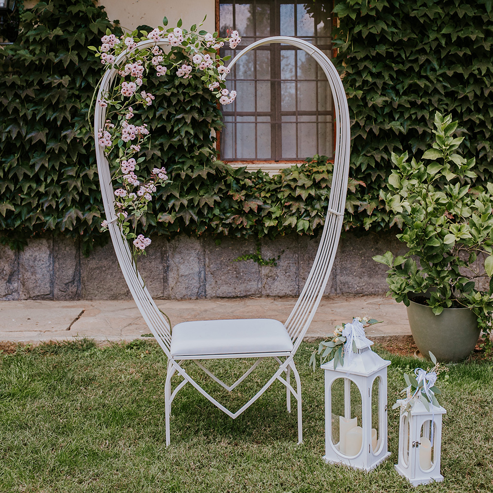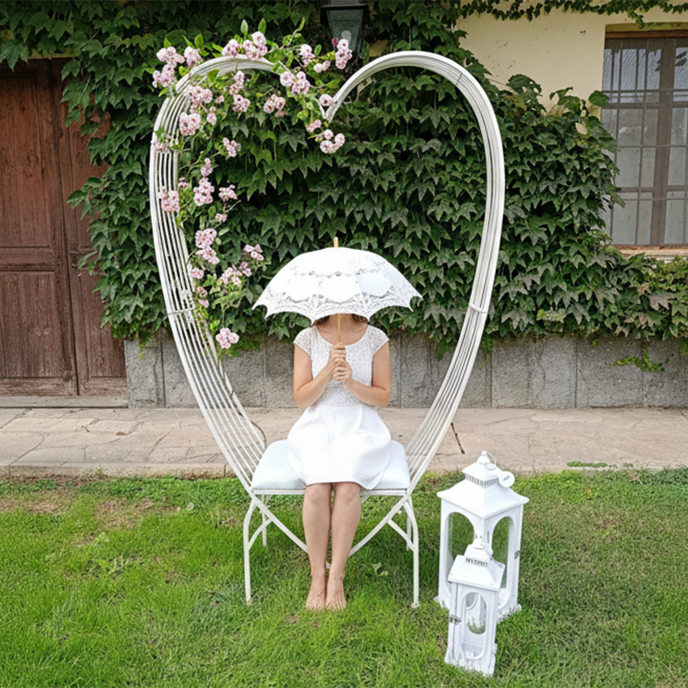Decorative white metal bench with heart-shaped design and cushioned seat, perfect for romantic settings and event décor.