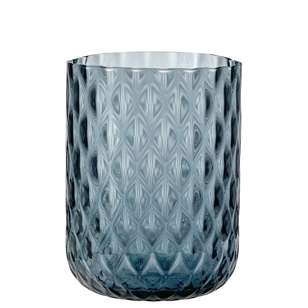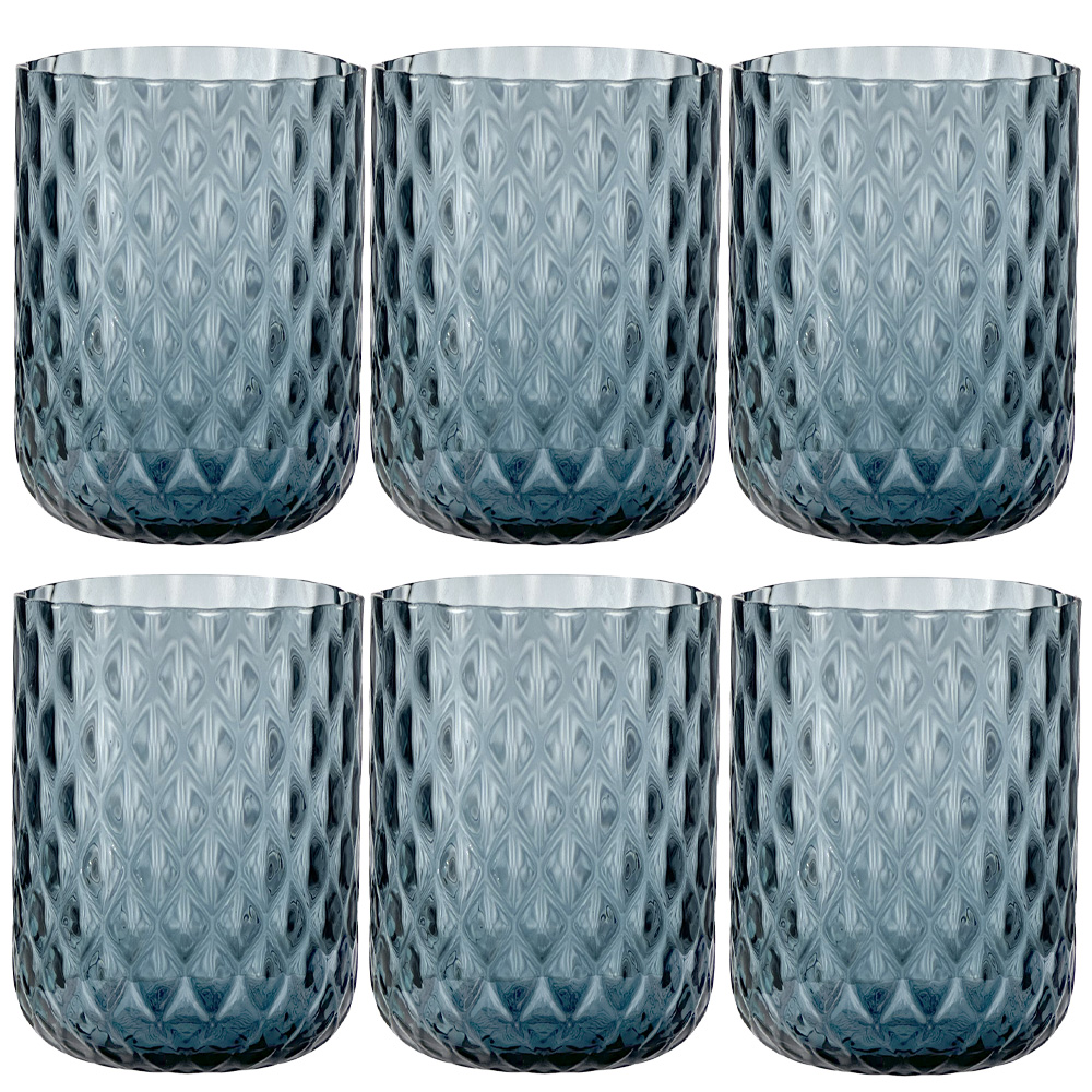 Made of hand-blown glass, these tumblers combine the artisanal delicacy of the material with a textured surface that captures and reflects the light, creating a luminous and refined effect.