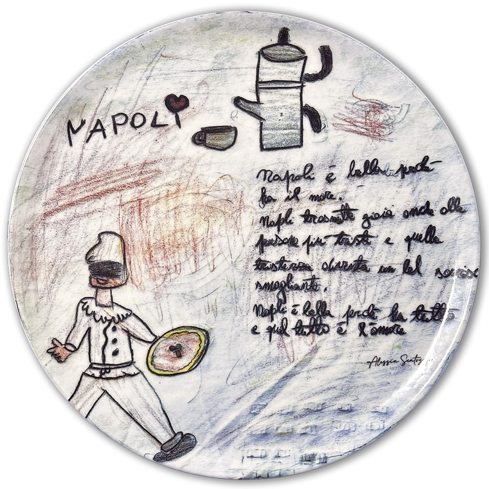 The plate features Pulcinella, depicted with a pizza, along with a moka pot and a coffee cup: iconic symbols of Neapolitan tradition. Completing the illustration is a poem handwritten by the same child, capturing the soul and emotion of Naples: