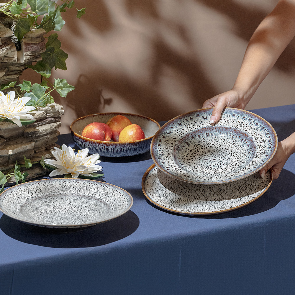 Porcelain flat plate, from the Krabi by Landhaus line. Dimensions 28 cm. The pattern and intensity of colors can vary from plate to plate creating unique shades.