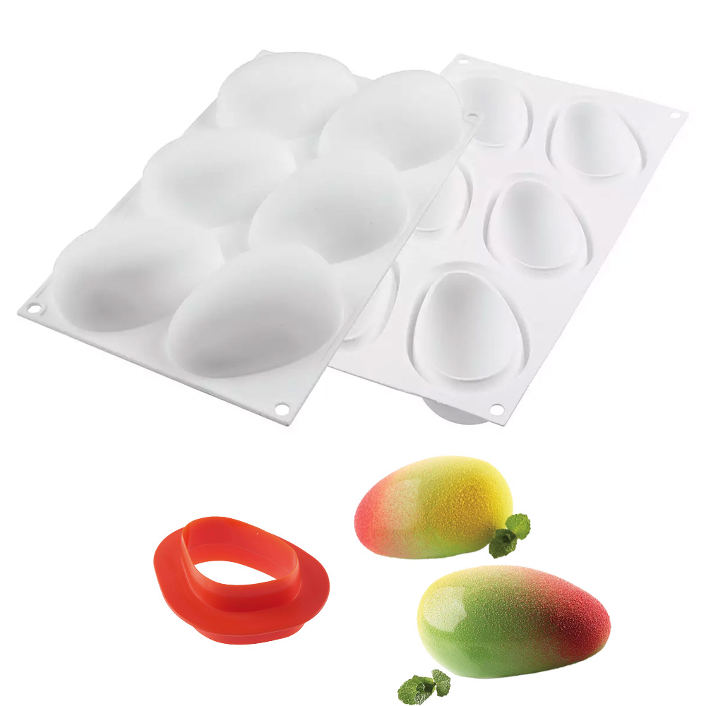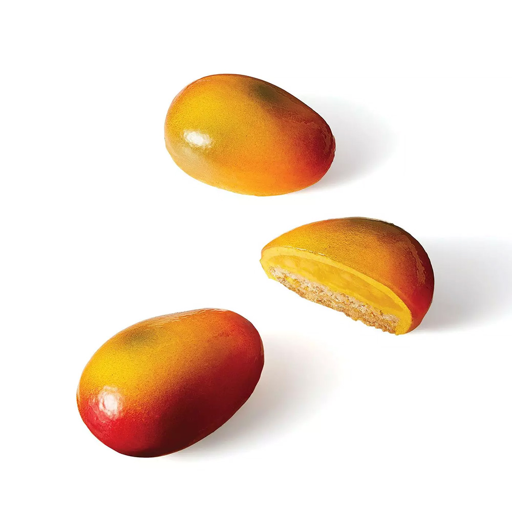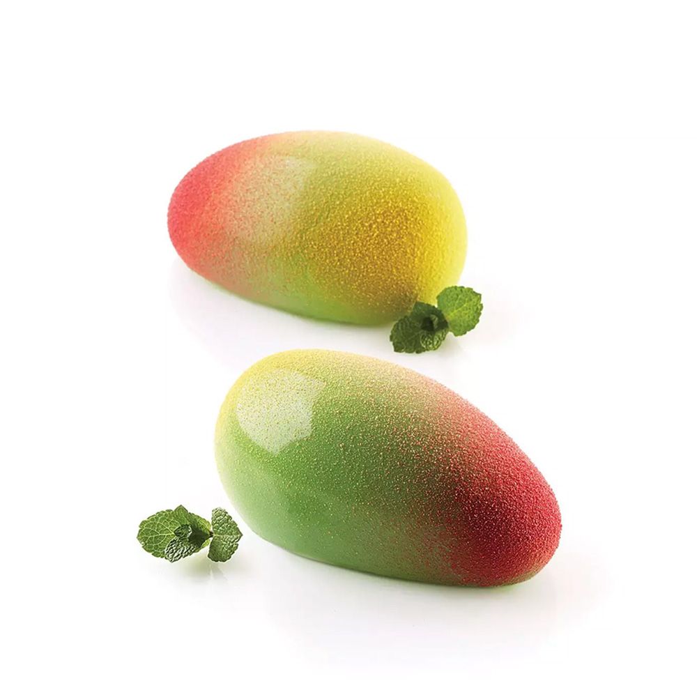 The kit includes a silicone mold to create mango-shaped single portions and an ABS cutter for shortcrust bases and custom inserts.