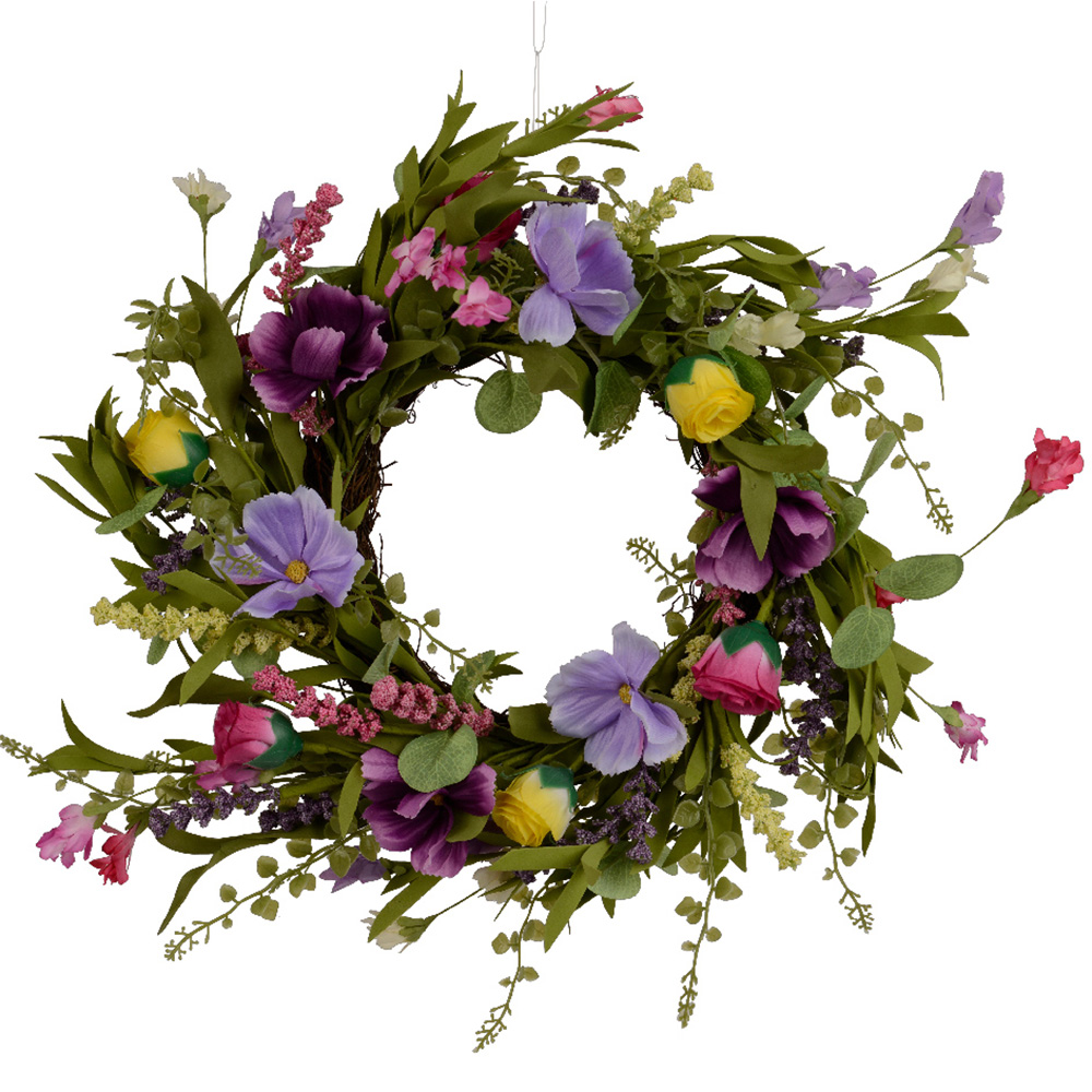 Pink-lilac floral wreath in polyester and PVC, with flowers, leaves, and decorative elements
