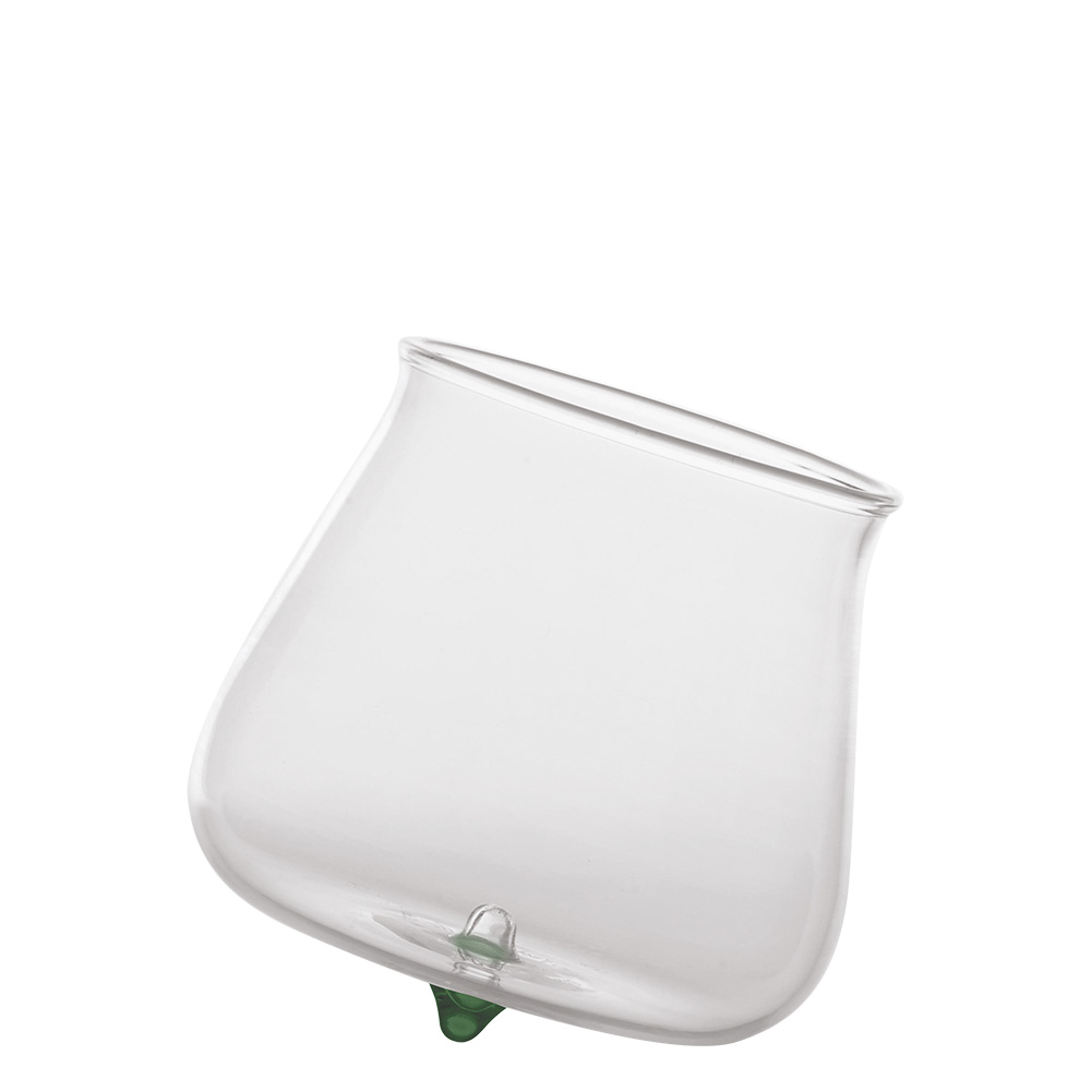 The shape of the glass, made of handcrafted borosilicate glass, echoes that of the spinning top: a small protruding element at the bottom allows it to rotate on its own axis, and to rest obliquely on the table.
