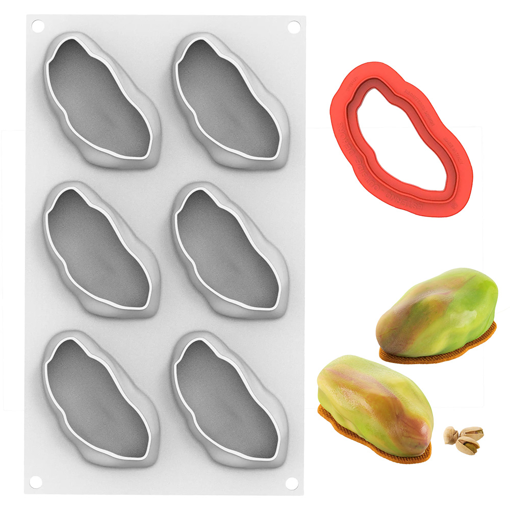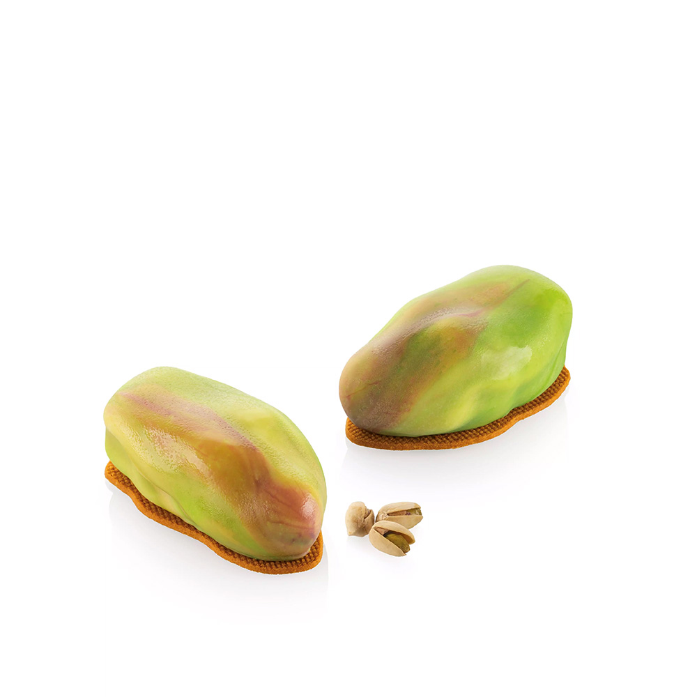 The kit includes a platinum silicone mold to create single-portion pistachios shapes and an ABS cutter for shortcrust bases and custom inserts.
