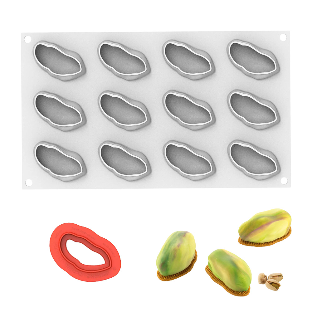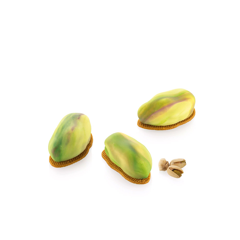 The kit includes a platinum silicone mold to create pistachio-shaped mignon portions and an ABS cutter for shortcrust bases and custom inserts.