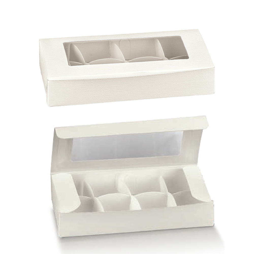 Rectangular Compartment Box, made of white fiber-effect cardboard, with transparent window lid, insert included