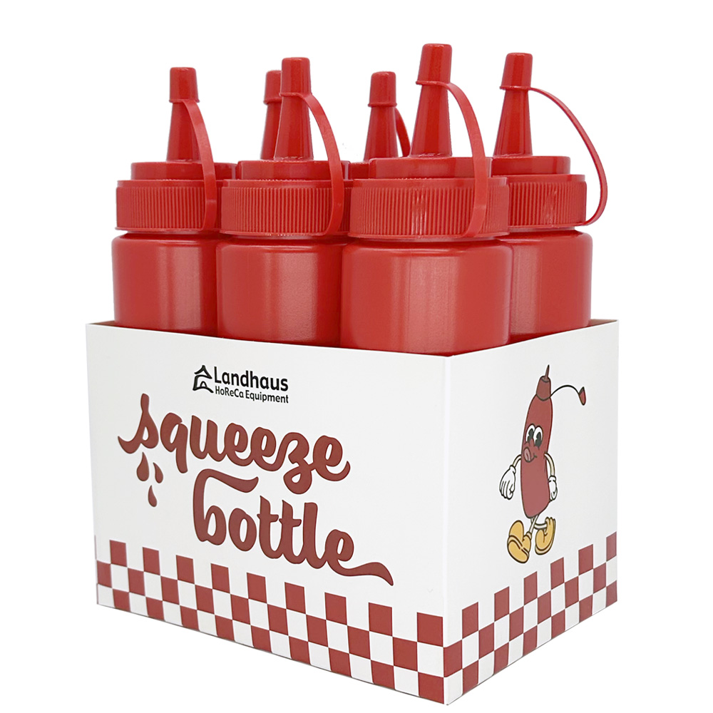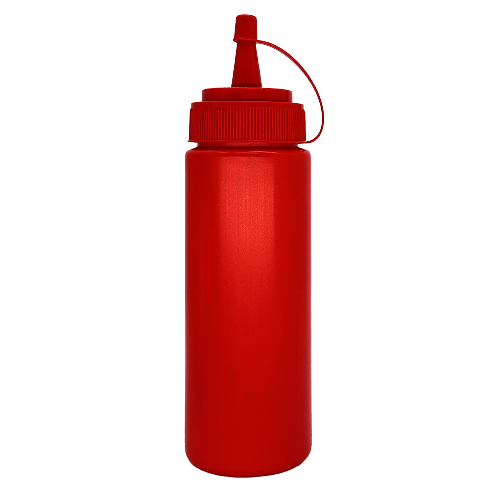 Red graduated Squeezer Bottle, made of polyethylene, suitable for contact with all food types and dishwasher safe.