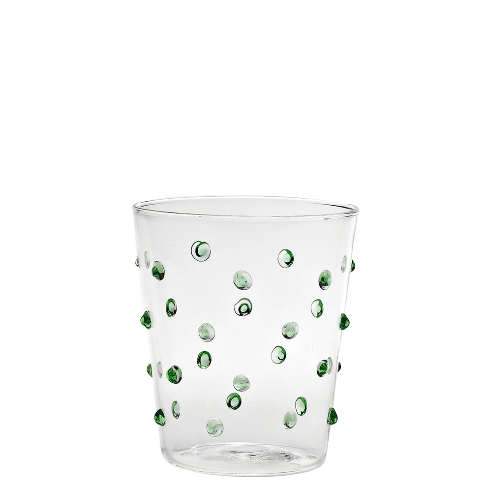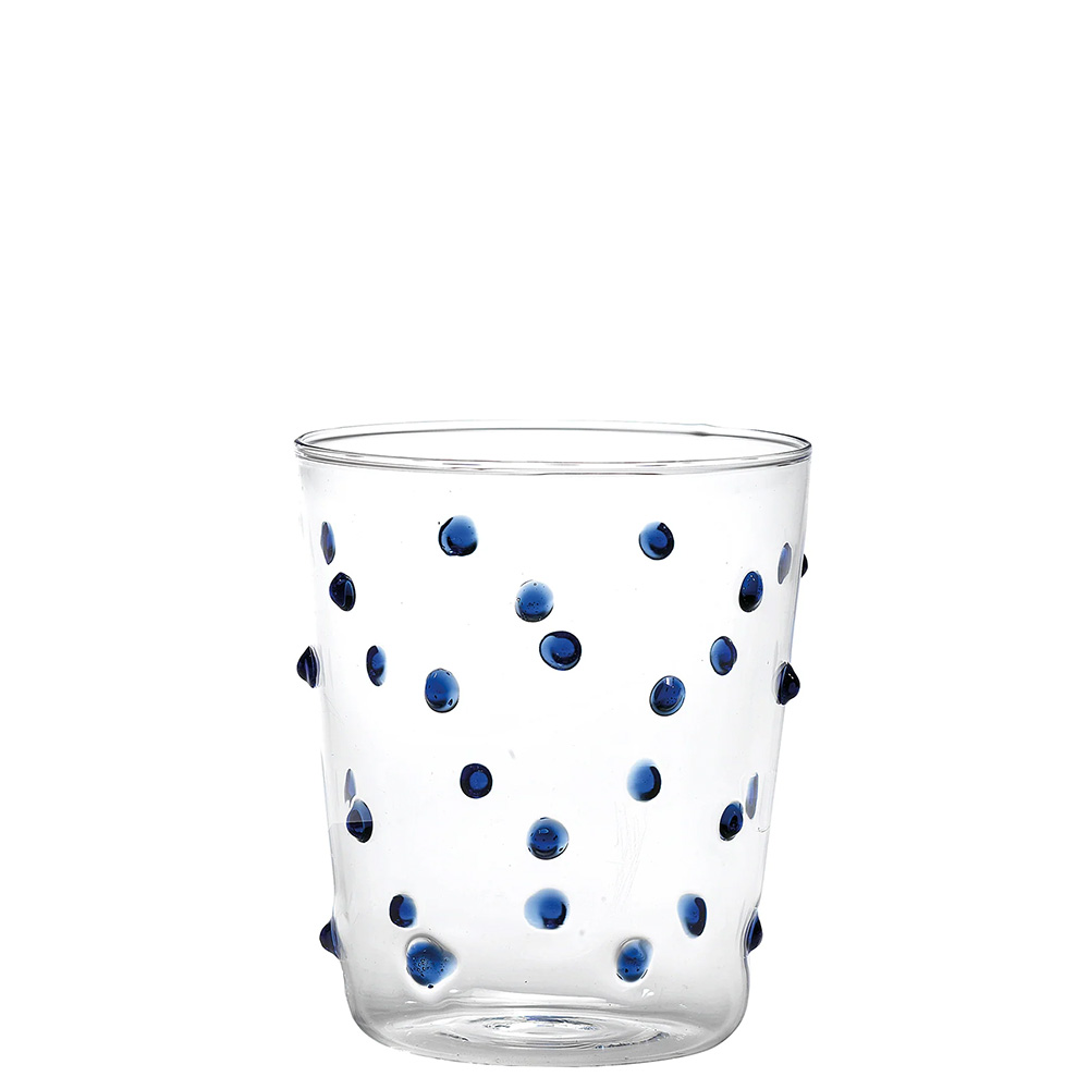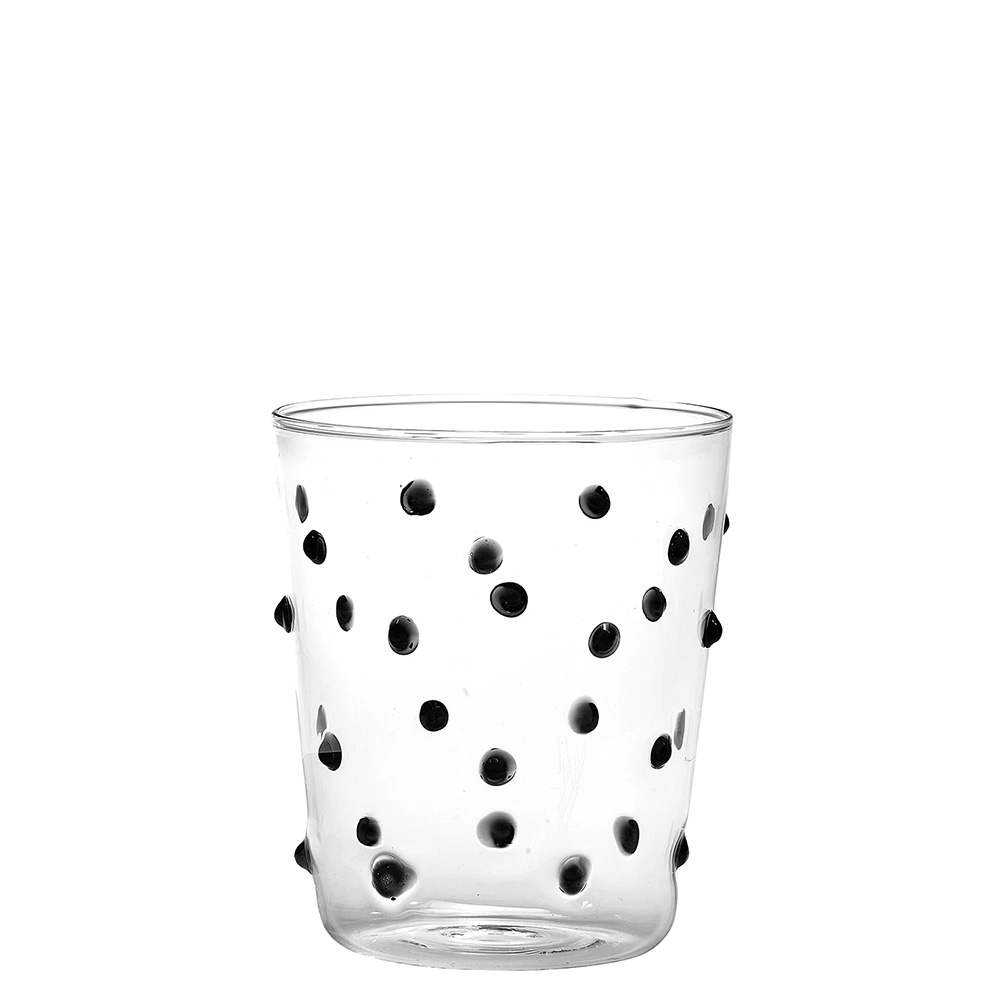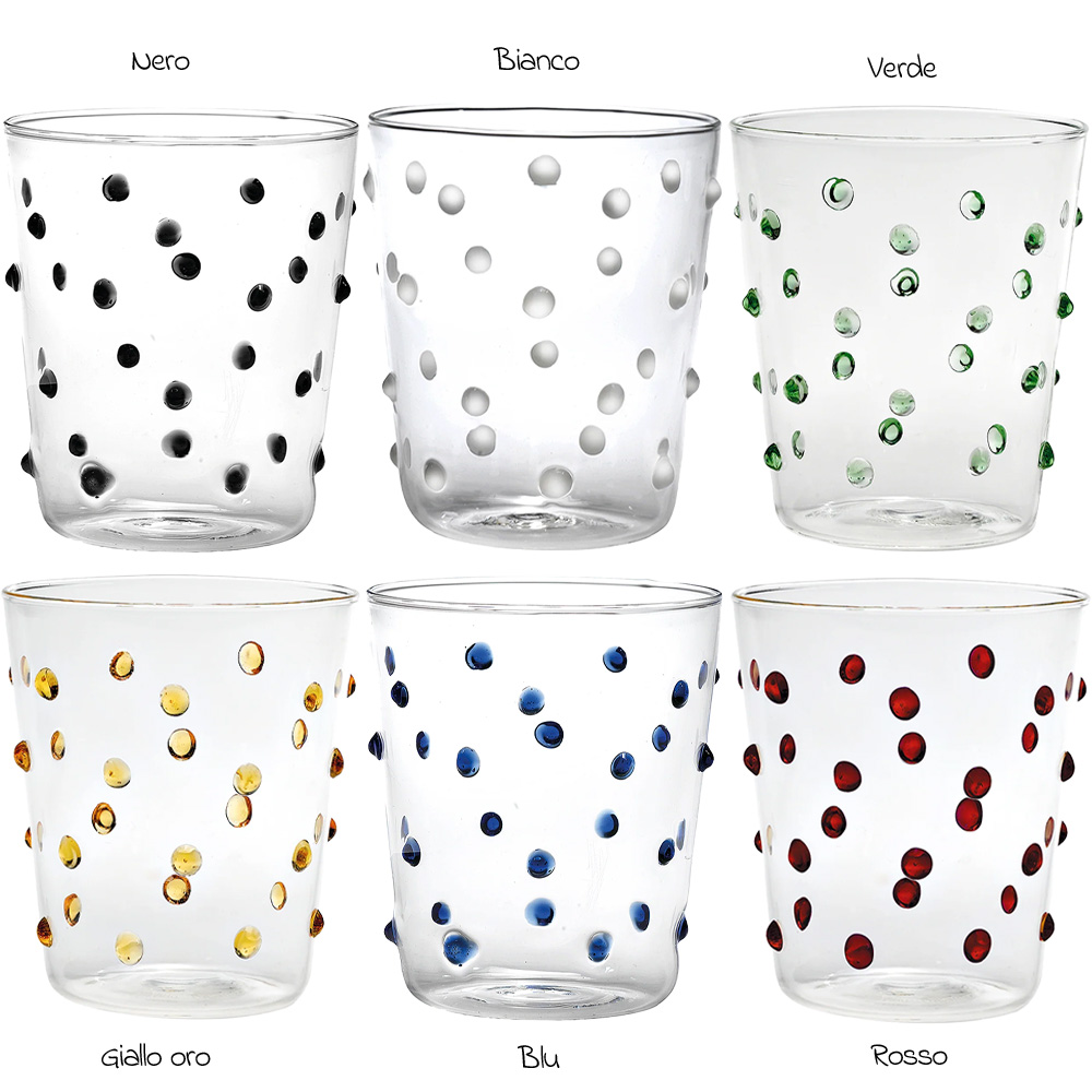 Glasses in transparent borosilicate glass for the Party Collection; refined encounter of colored pearls on these capacious and generous glasses, worked with patience and skill.