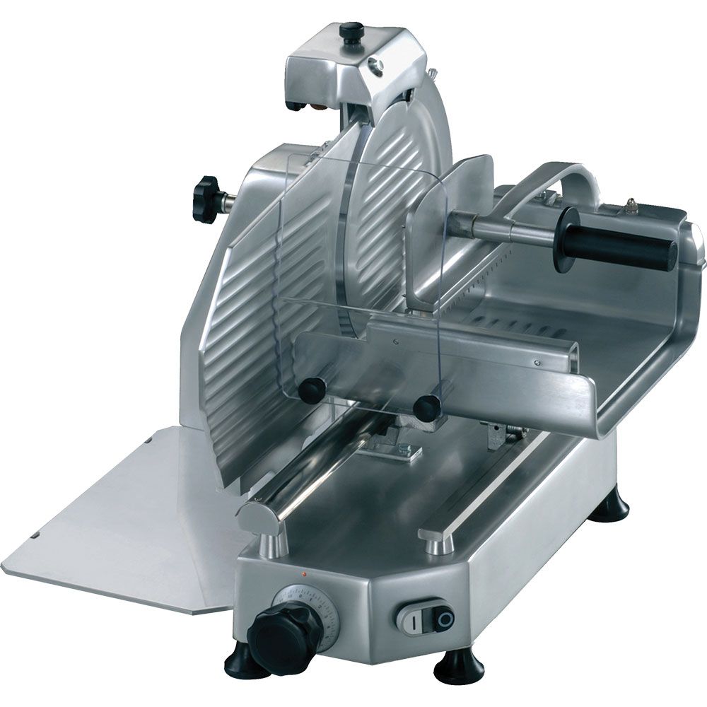 Verticale slicer 350 MEAT Blade Ø mm 350 - Single-phase ventilated engine HP 0,50 - Rpm 260 - Cut thickness range mm.0-16 - Cut: L x H mm 300x250 Made of aluminum alloy , anodized treated , are easy to clean. The regulator of cutting thickness from 0 to 16 mm is very sensitive and allows a decimal adjustment . The blade sharpener is easy to assemble for the user's work effective and sharp cutting . The plate mounted on ball bearings features exceptionally smooth running to cut heavy sausages, roasts, cheese, fish, compact meat and other. Available single and three phase on request.