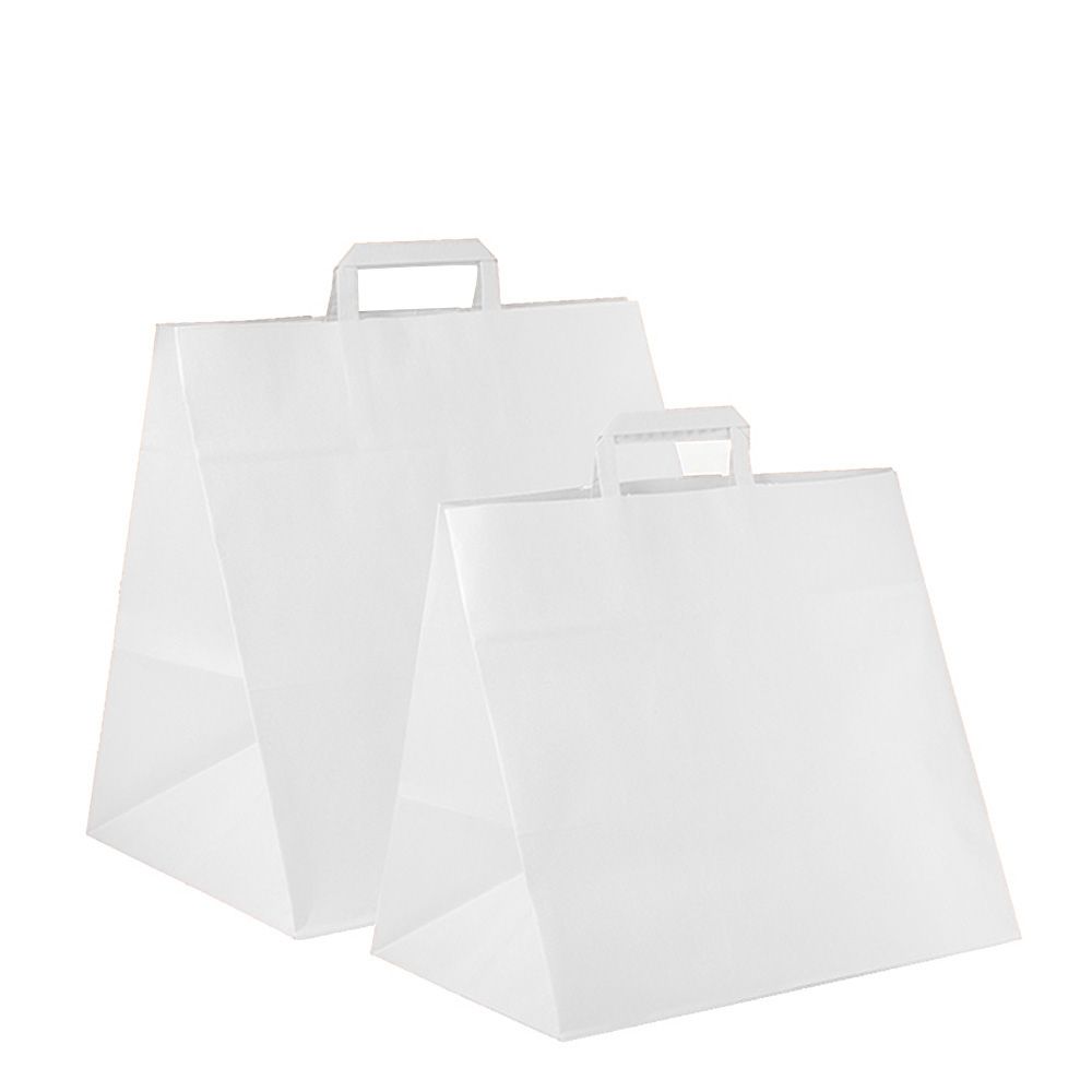 Shoppers in 70 gram white paper with a reinforced flat handle and side gusset in various formats that make them adaptable to various uses.