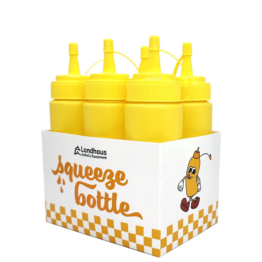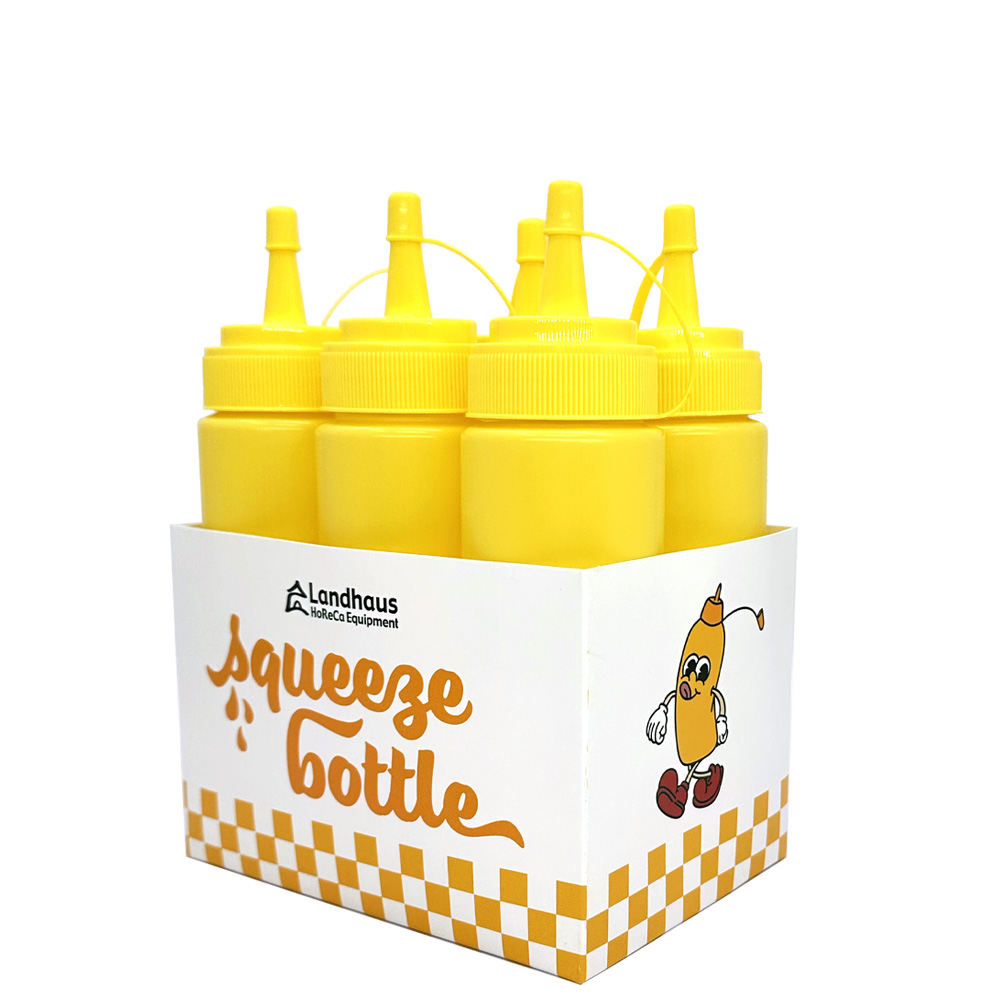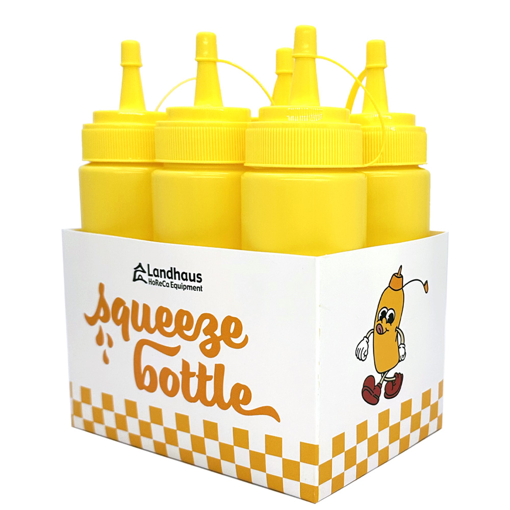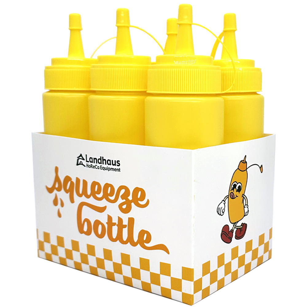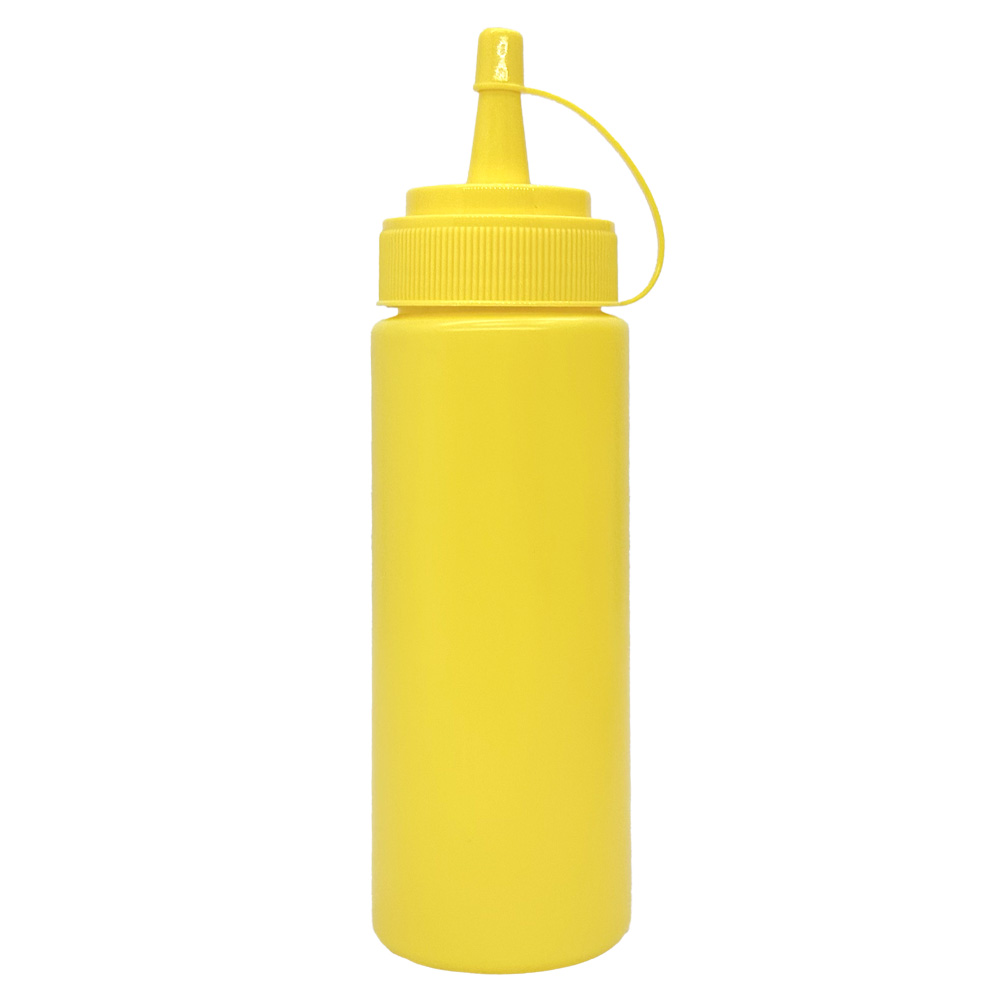 Yellow graduated Squeezer Bottle, made of polyethylene, suitable for contact with all food types and dishwasher safe.