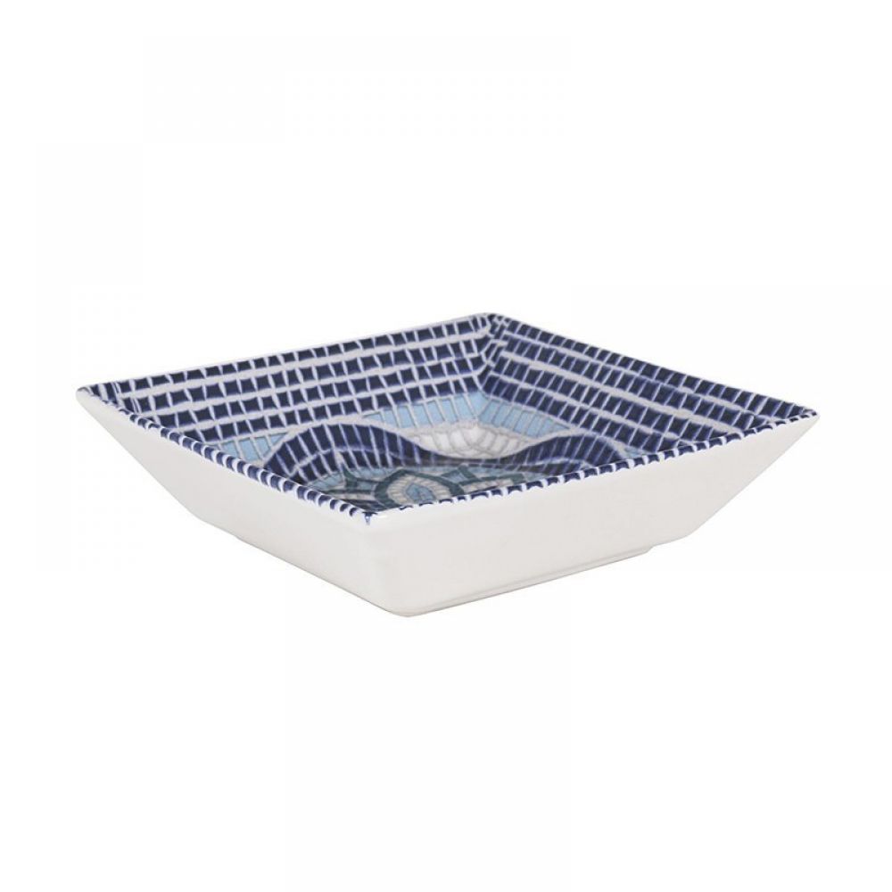 Plate with relief decoration, characterized by a blue Mayolica in mosaic style. The square deep plate is a gem of the Mayolica line, make it the frame of your dishes, even the most gourmet ones.