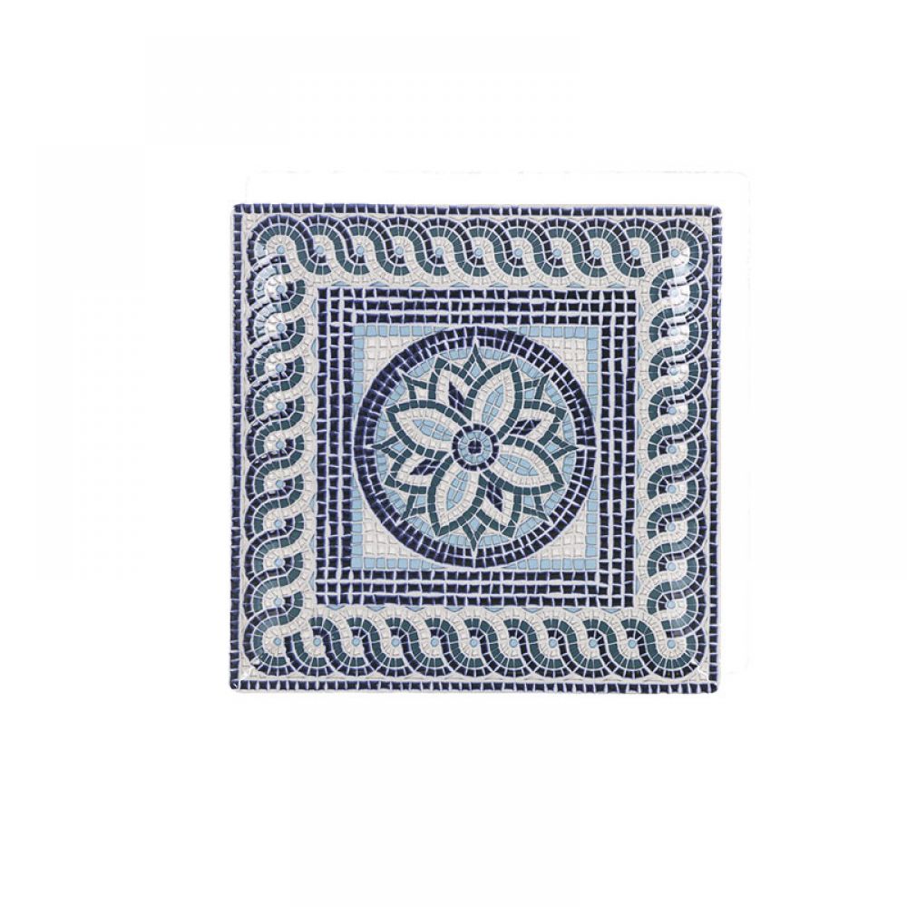 late with relief decoration, characterized by a blue Mayolica in mosaic style. The 16 cm square plate is used as a saucer for bread, but also to serve small pastries, both at the table and on the counter. The right compromise for a single portion.
